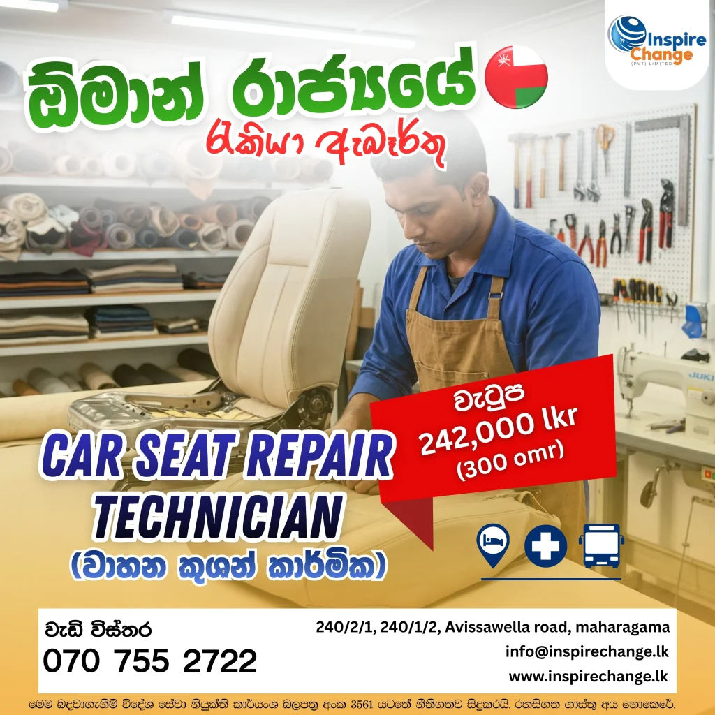 We are currently hiring experienced Car Upholsterers for reputed automobile workshops and interior modification companies in Oman. This is an excellent overseas opportunity for skilled Sri Lankan professionals seeking a tax-free salary, stable employment, and full company-provided benefits.